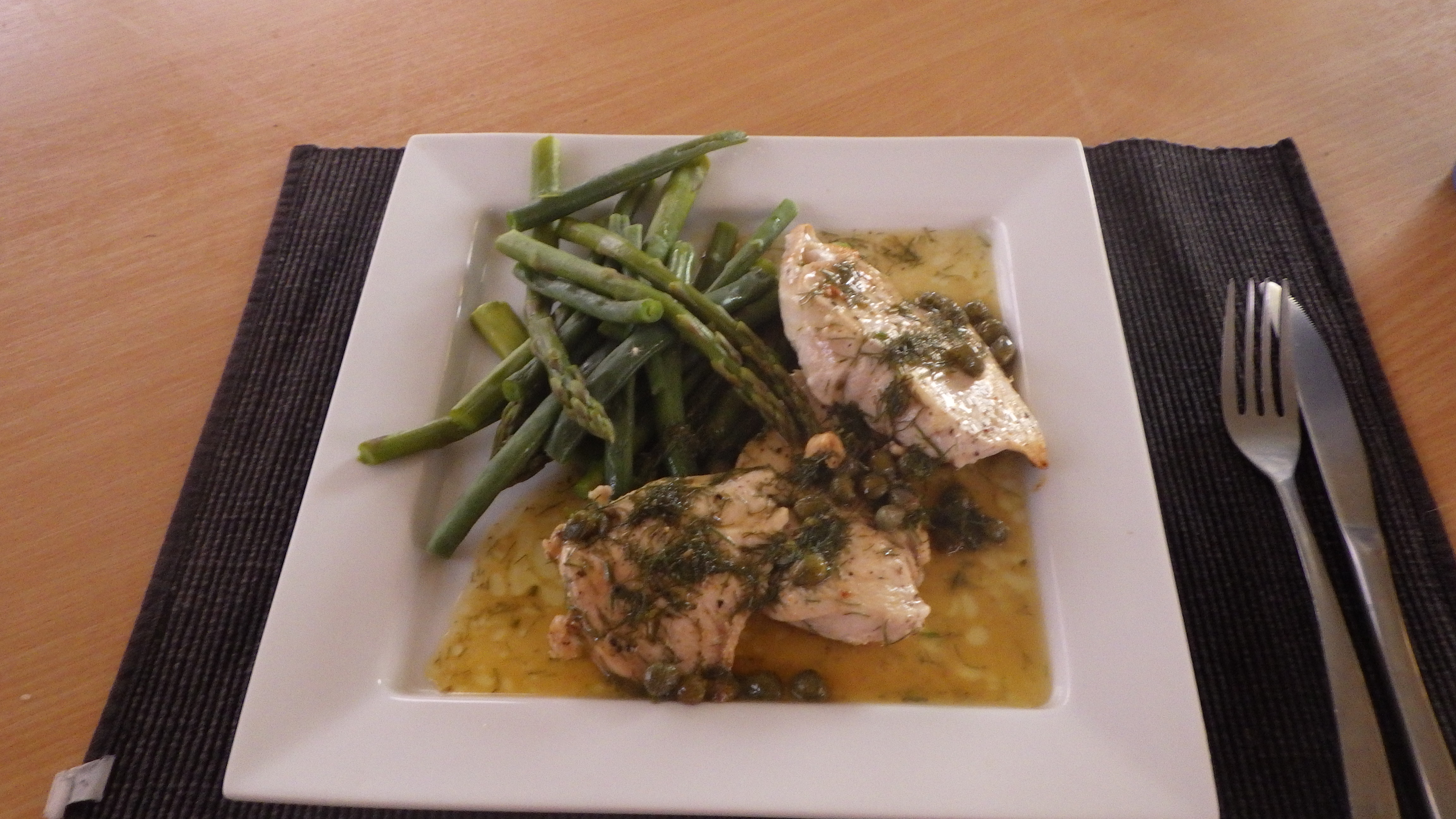 Keeping things very simple, fresh and light! So easy I'm just writing it out, all you need is: 2 Chicken breast, sliced. 2 cloves of  garlic, smashed. Zest and juice of 2 lemon. 2 tblsp olive oil. Marinate the above for at least 30 mins (in a non metallic bowl to avoid lemon juice reacting). Sauce ingredients: 2 heaped tblsp fresh chopped dill, 1 heaped tblsp capers, knob of butter, freshly ground black pepper, juice of 1/2 a lemon. Fry the chicken slices on high heat until ...