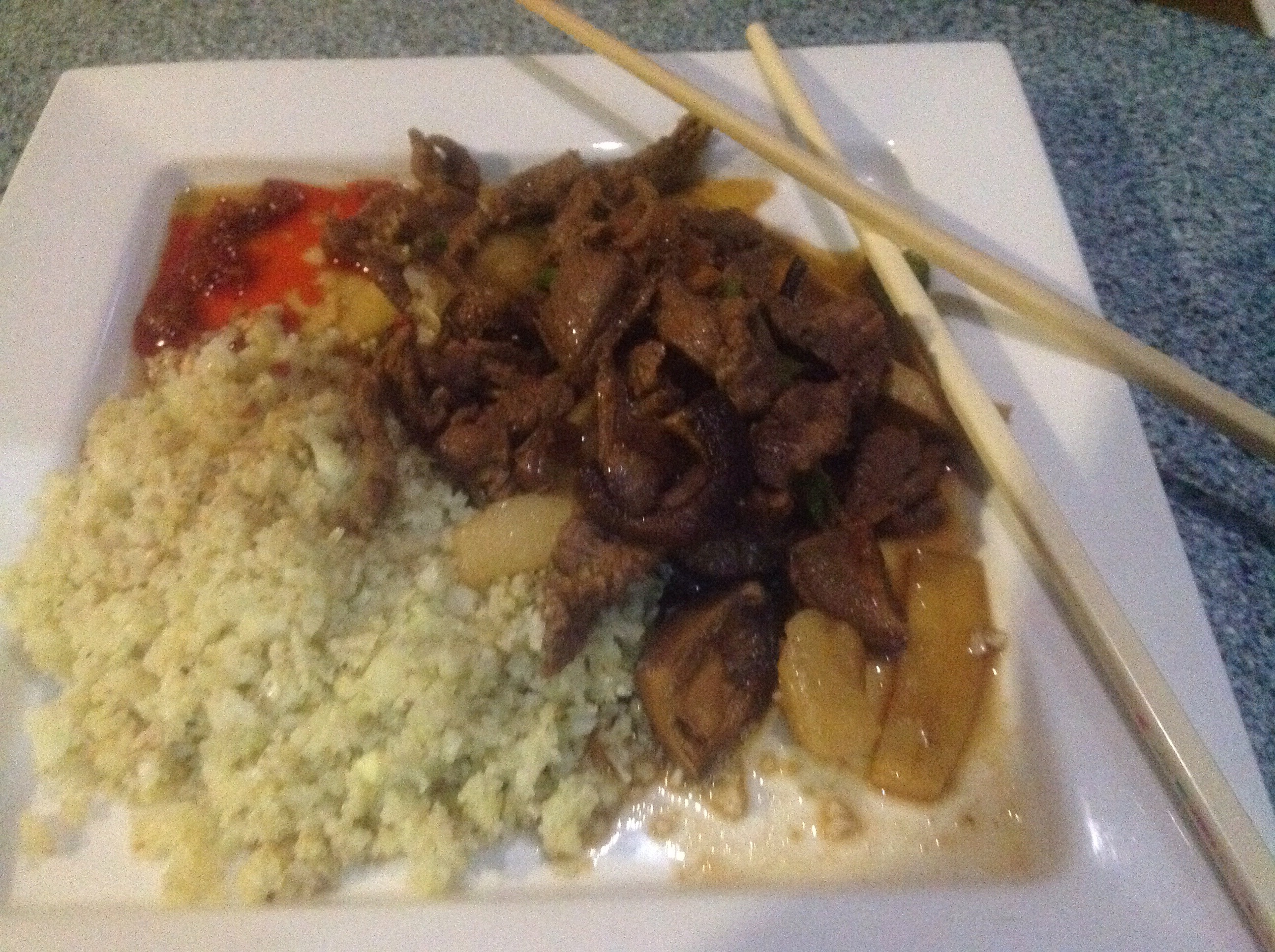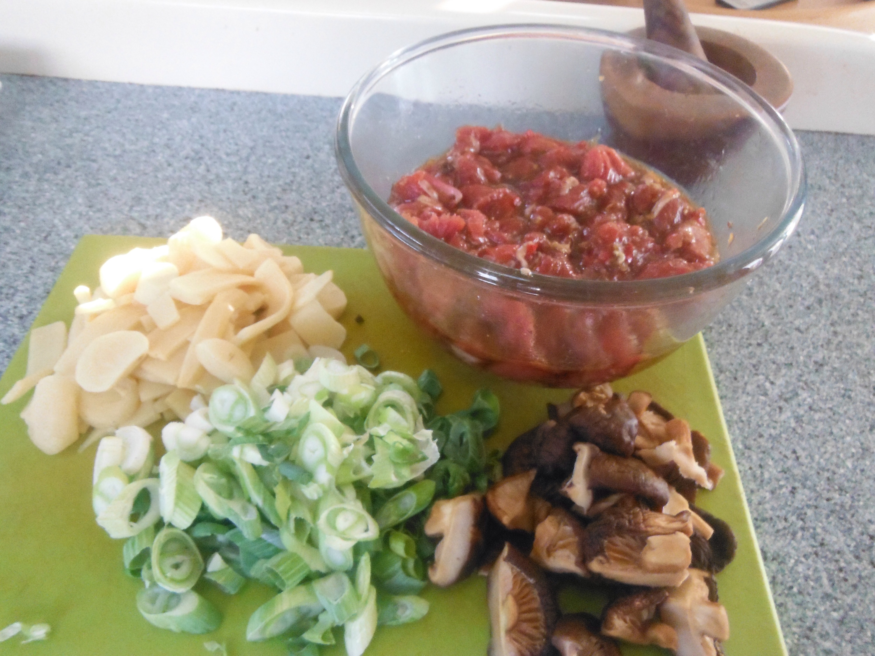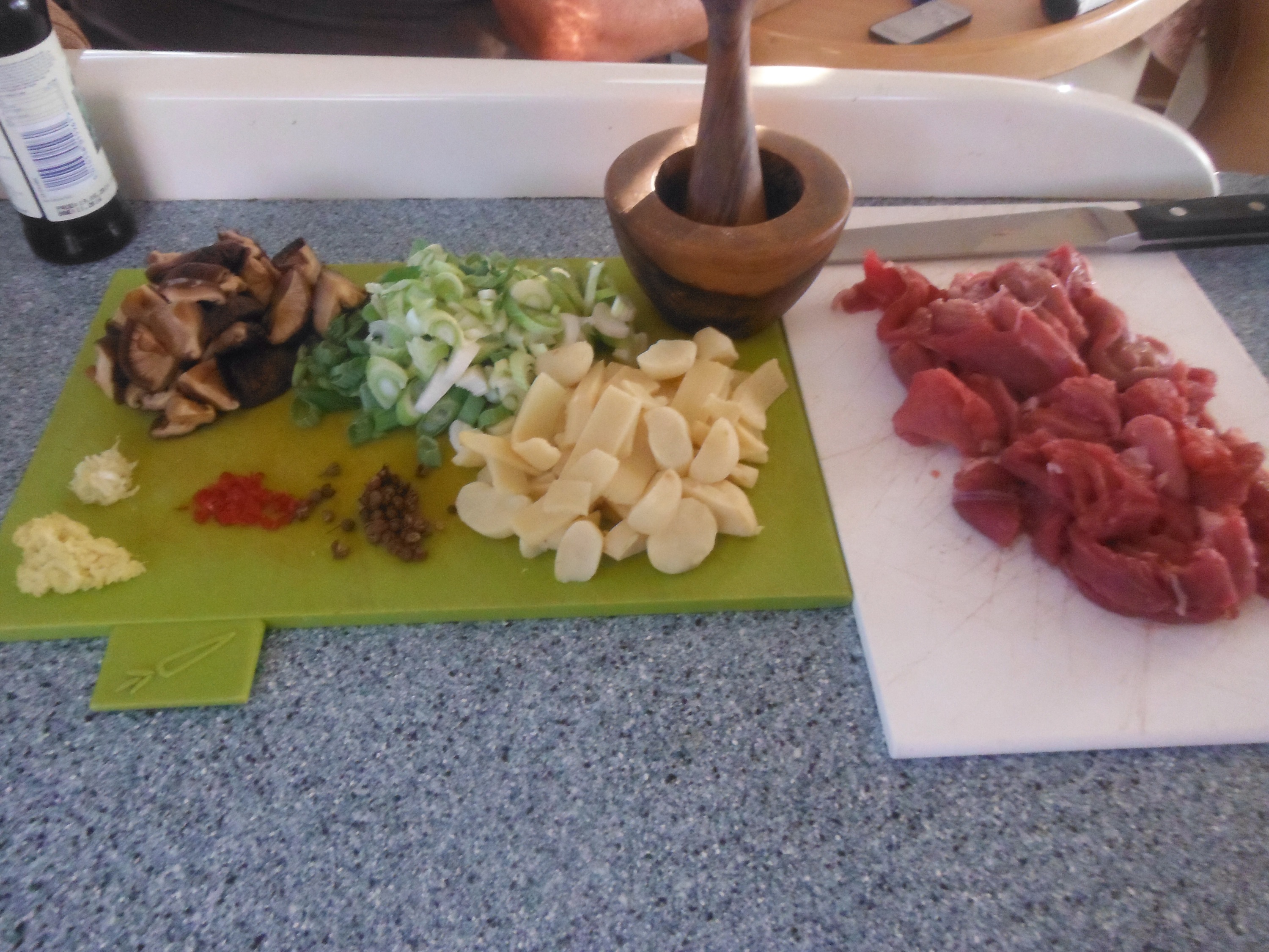 300g thin slices of beef, cut into strips. A couple of cloves of garlic and a knob of ginger, grated. Finely diced de seeded chilli depending on your “hot” radar. A tin of mixed water chestnuts and bamboo shoots. Some Chinese mushrooms soaked in hot water for 2 hours. A couple of spring onions, finely sliced diagonally. Szechuan peppercorns, bashed. Teriyaki marinade and a little oil.