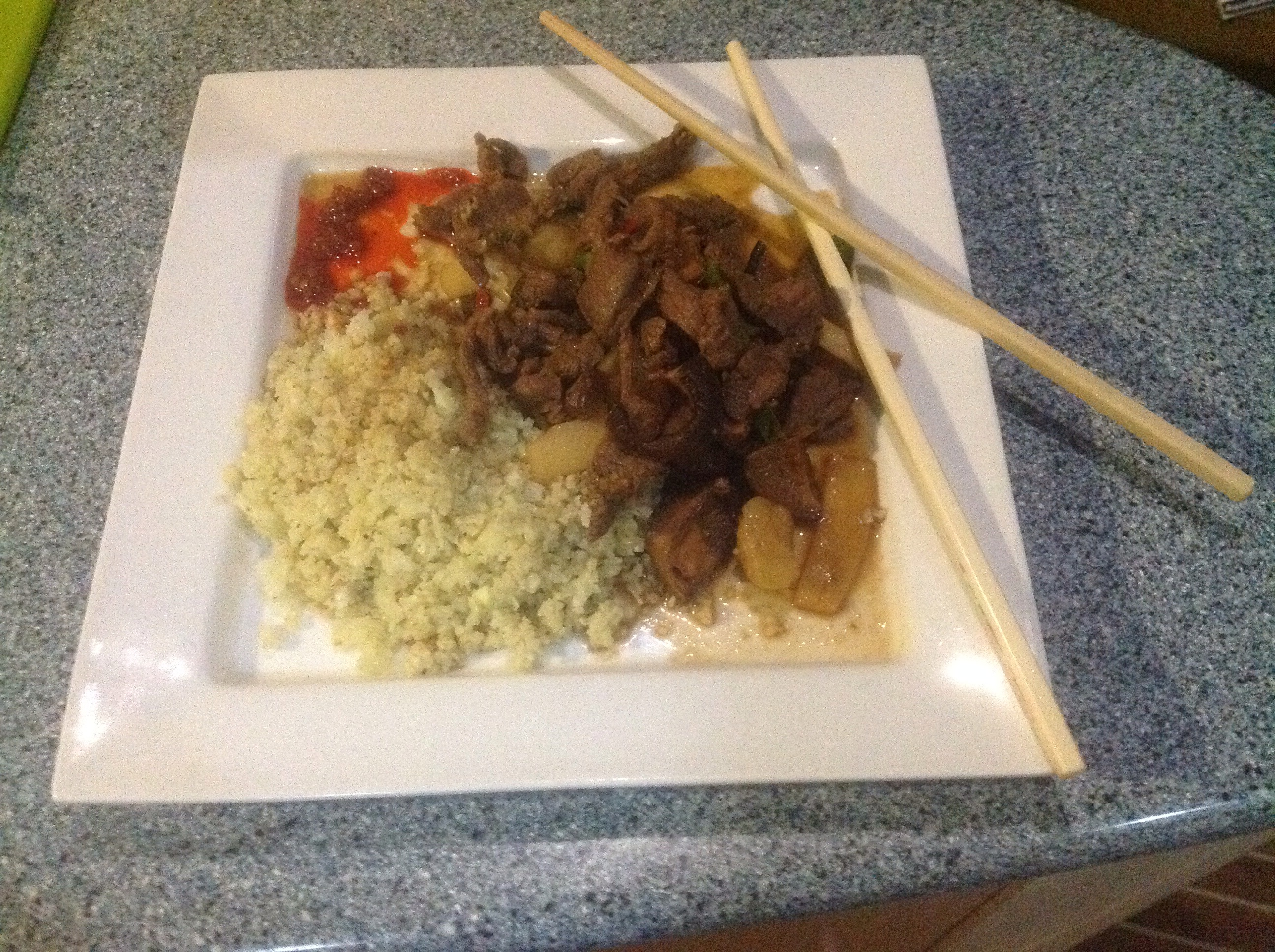 Stir fry the beef, add other ingredients except the spring onions. Serve with whatever you fancy, sprinkling the spring onions on top for added crunch and vibrancy. Nom nom!