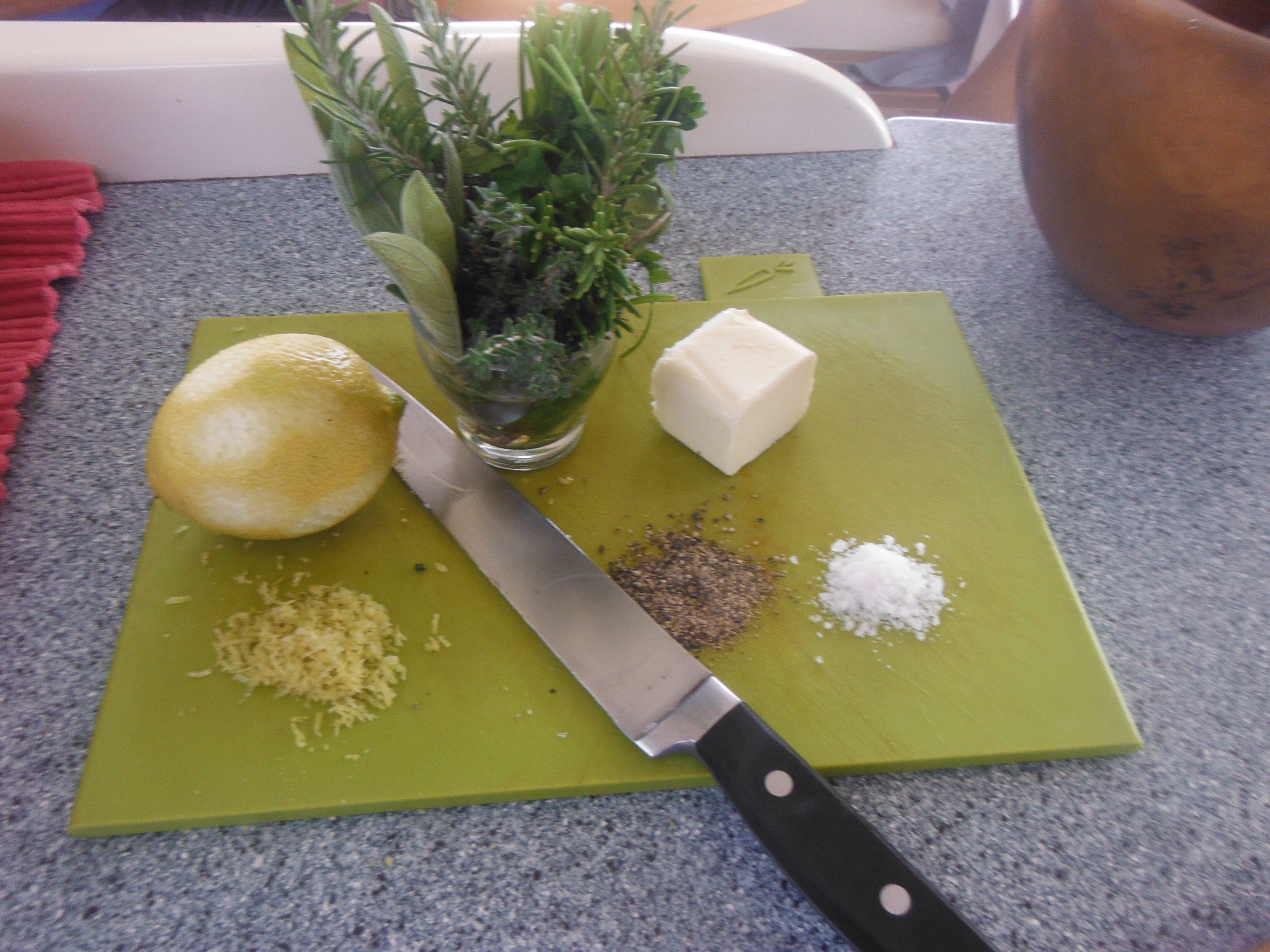 Parsley, sage, rosemary and thyme chopped very finely. Mix with zest of 1 lemon (don’t throw the lemon away) and roughly 50g of butter plus sea salt and freshly ground black pepper. Mix all together until you have a smooth paste.