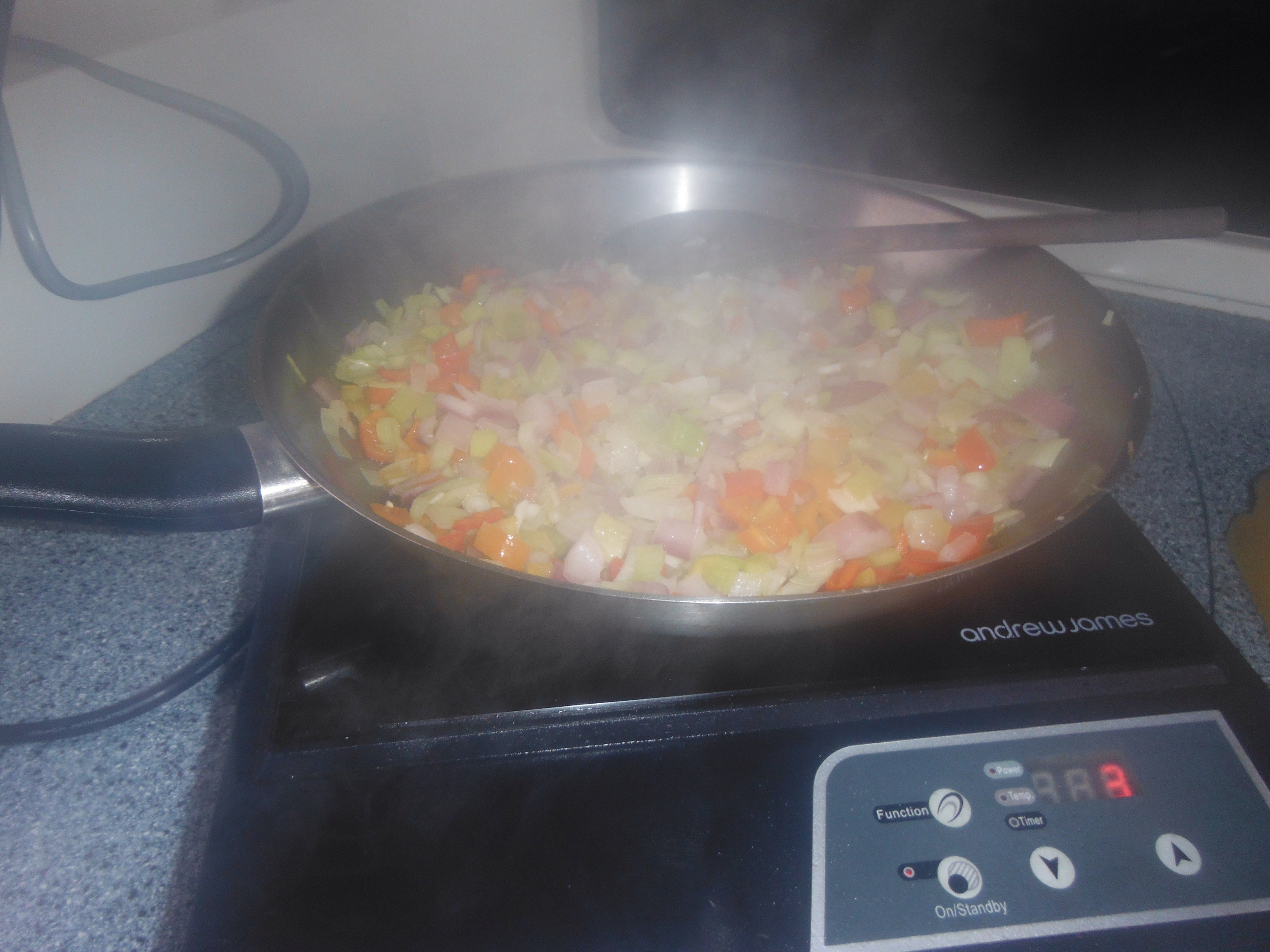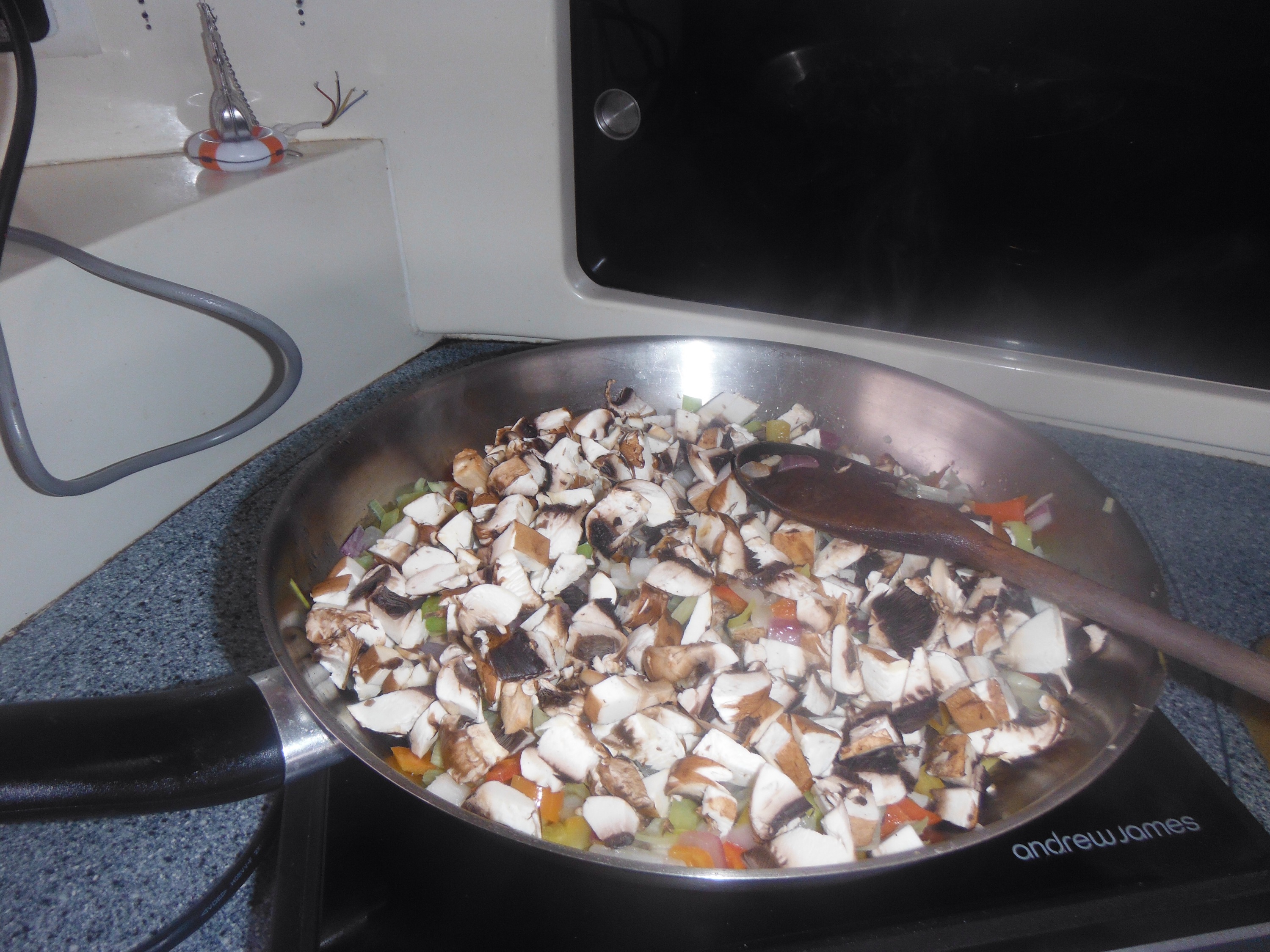 1 finely diced red onion, 1 finely diced white onion, 2 fat cloves of chopped garlic, a couple of de seeded red or green peppers, as many chopped mushrooms as you like until softened in a little olive oil. (I also tend to add chopped leeks, finely chopped celery, grated carrots and courgettes – boost the veg intake and flavour but it’s not to everyone’s liking perhaps?)