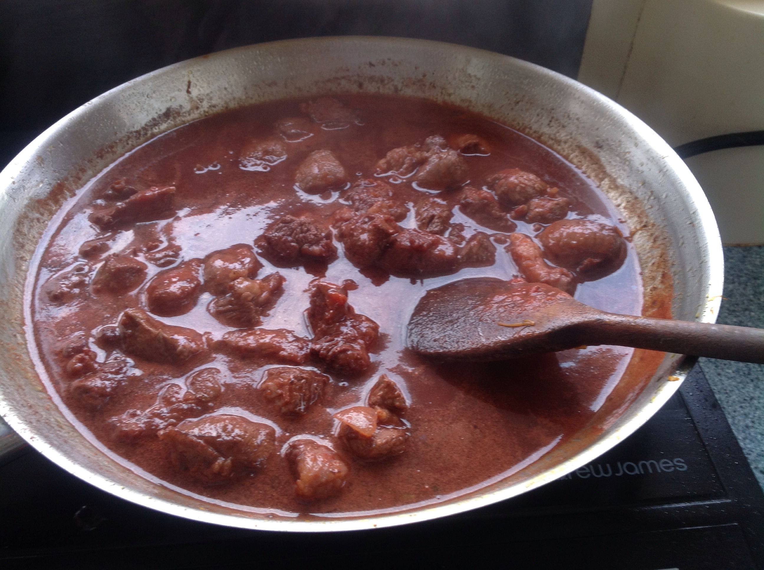 Sear chopped beef until browned and season to taste. Add a two glasses of good red wine, 250ml of passata and a glass of water together with a beef stock (liquid pot) and a splash of Lea &. Perrins.