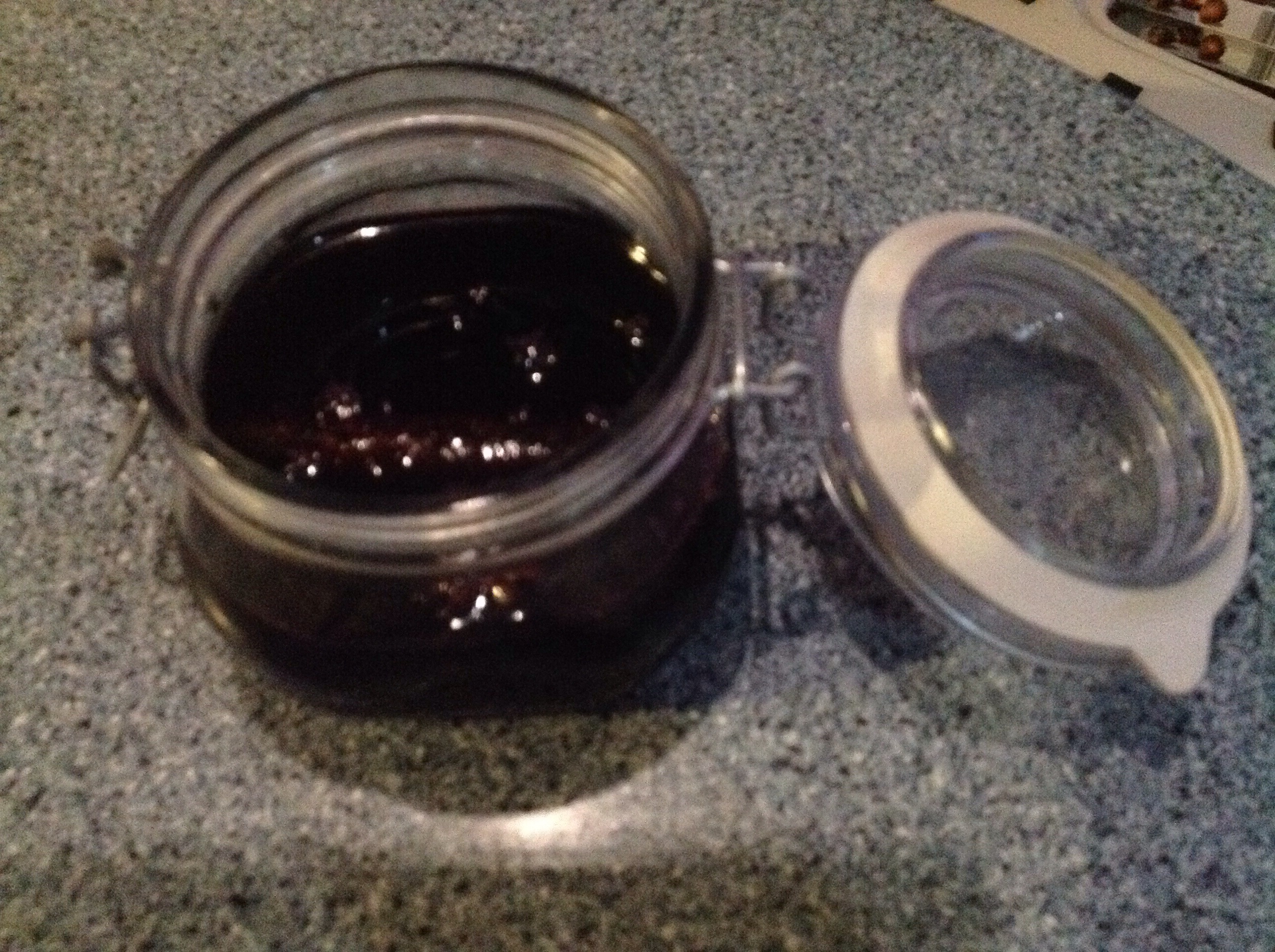 Heat gently stirring until the sugar is dissolved then bring to the boil and just let it bubble away for about 20 minutes or until the liquid has reduced by half. Cool slightly then put in a jam jar and into the fridge. It takes a couple of hours to set. I left the spices in as it looks pretty.