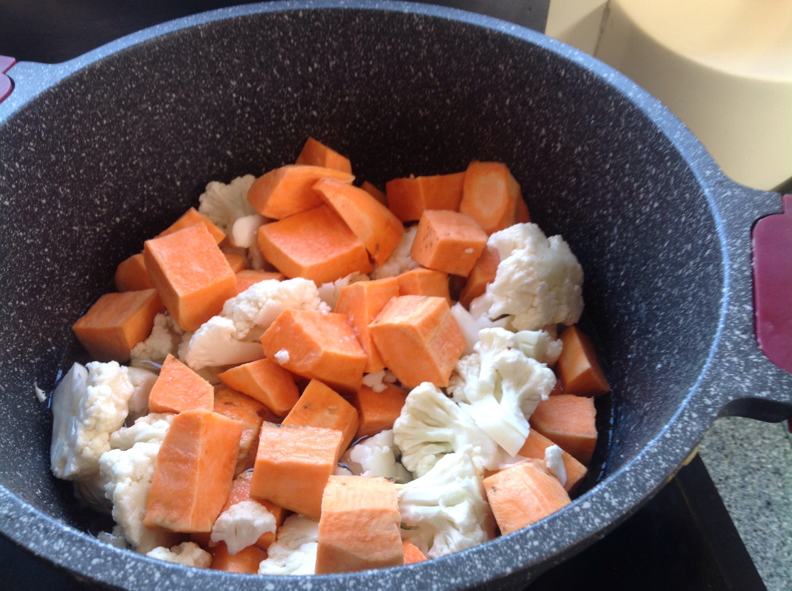Peel and cube 2 medium sized sweet potatoes, wash and break half a head of cauliflower. Add about 80 ml of water, season and simmer for approximately 10 minutes until soft. You may need to add a little water half way through.