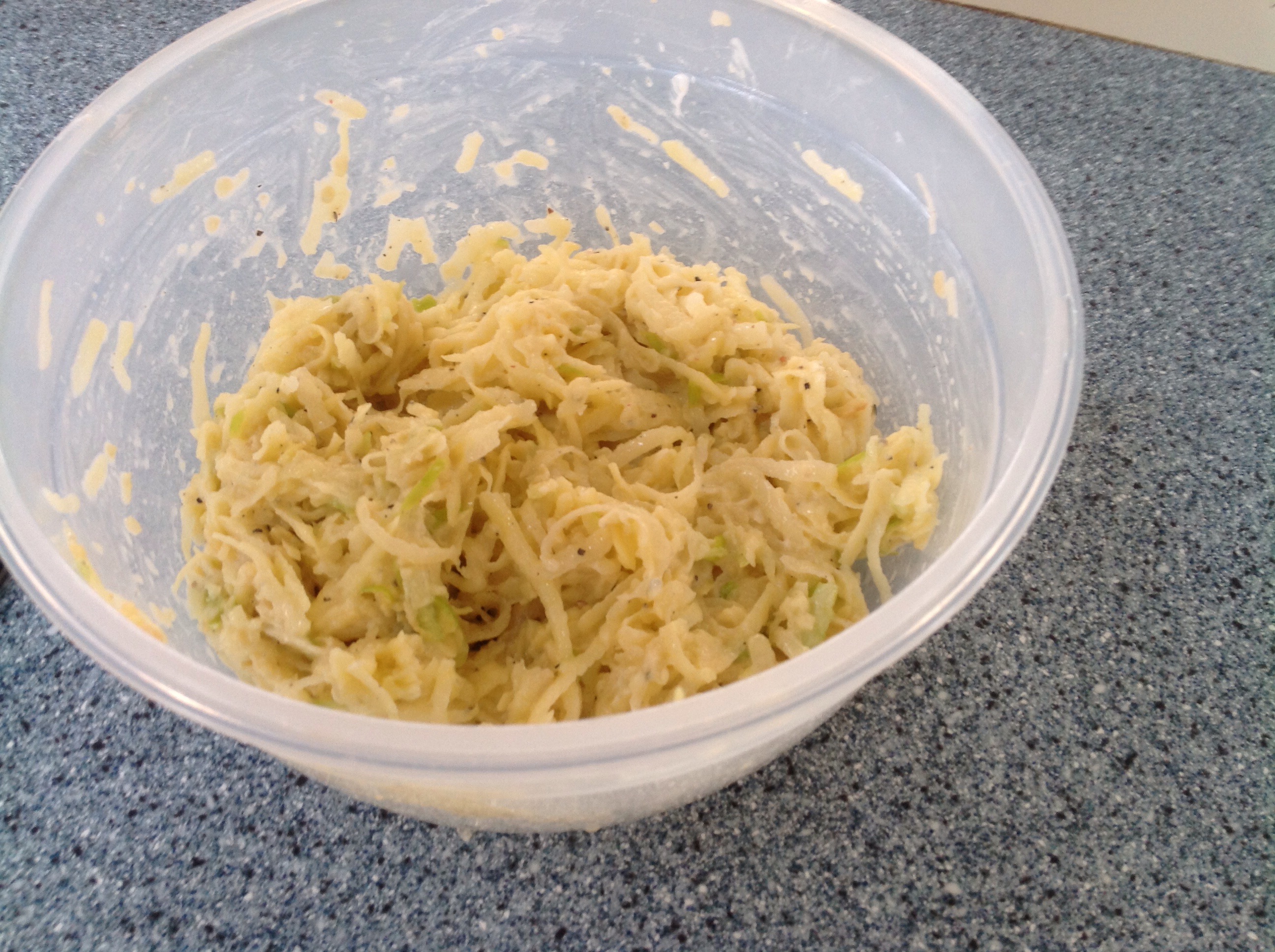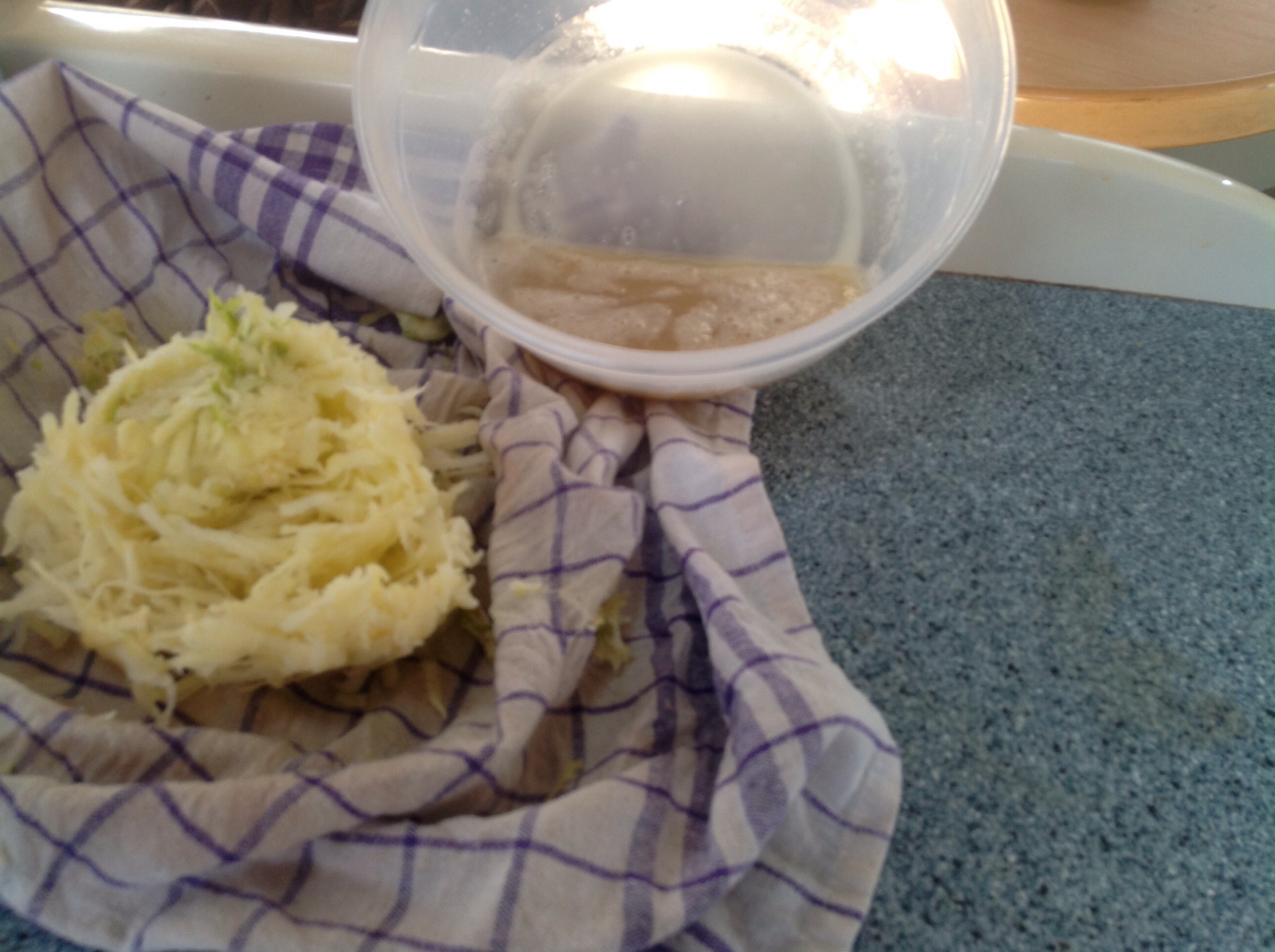I made four rosti, for which I used 2 medium sized potatoes. Half an apple and half an onion. Just roughly grate these things and pop them on a clean cloth. Then squeeze as much of the liquid out of the ingredients. You’ll be amazed how much comes out and if the mixture is too wet you won’t get a good result.