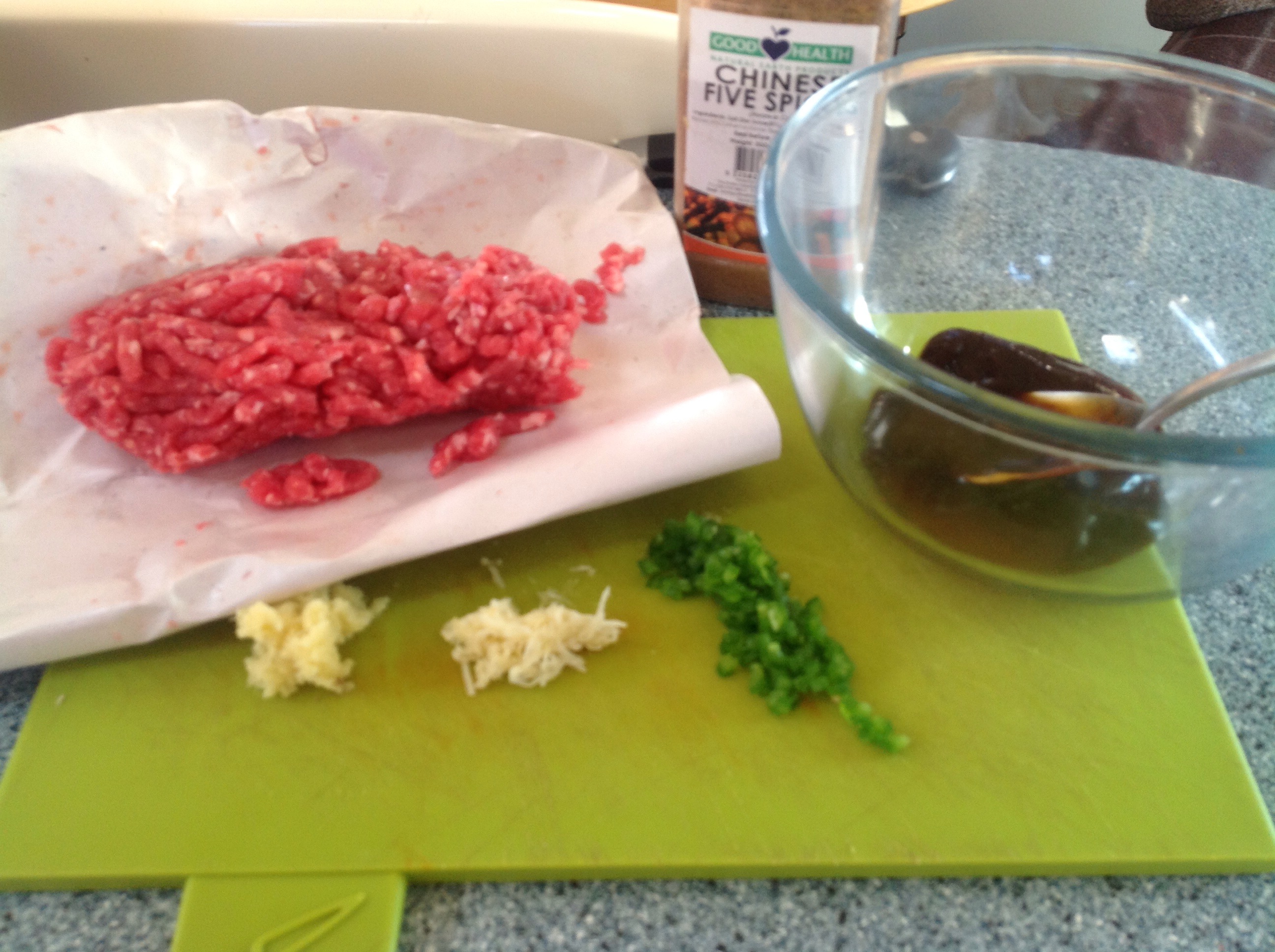 Grate garlic , ginger and chilli to suit your taste. Chop a sping onion and coriander. Into a non metallic bowl pop 1 1/2 tblsp of hoisin sauce and 1 of oyster sauce. Add 1/2 tsp of Chinese five spice, some black pepper and a good tblsp of oil (I used coconut). Cover and leave for an hour or so for flavours to develop.