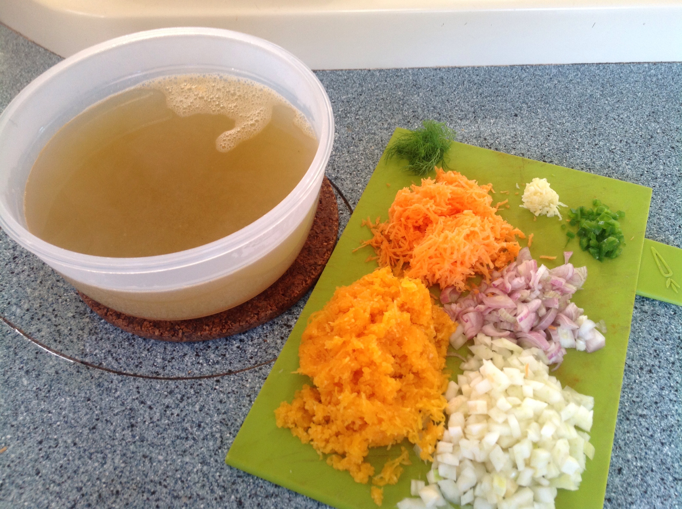 Finely chop a couple of shallots, 2 celery stalks, some finely chopped fennel, a de seeded chilli and a couple of cloves of grated garlic until softened. Add grated butternut squash and grated carrot (this thickens and adds sweetness) sauté for another 5 mins.