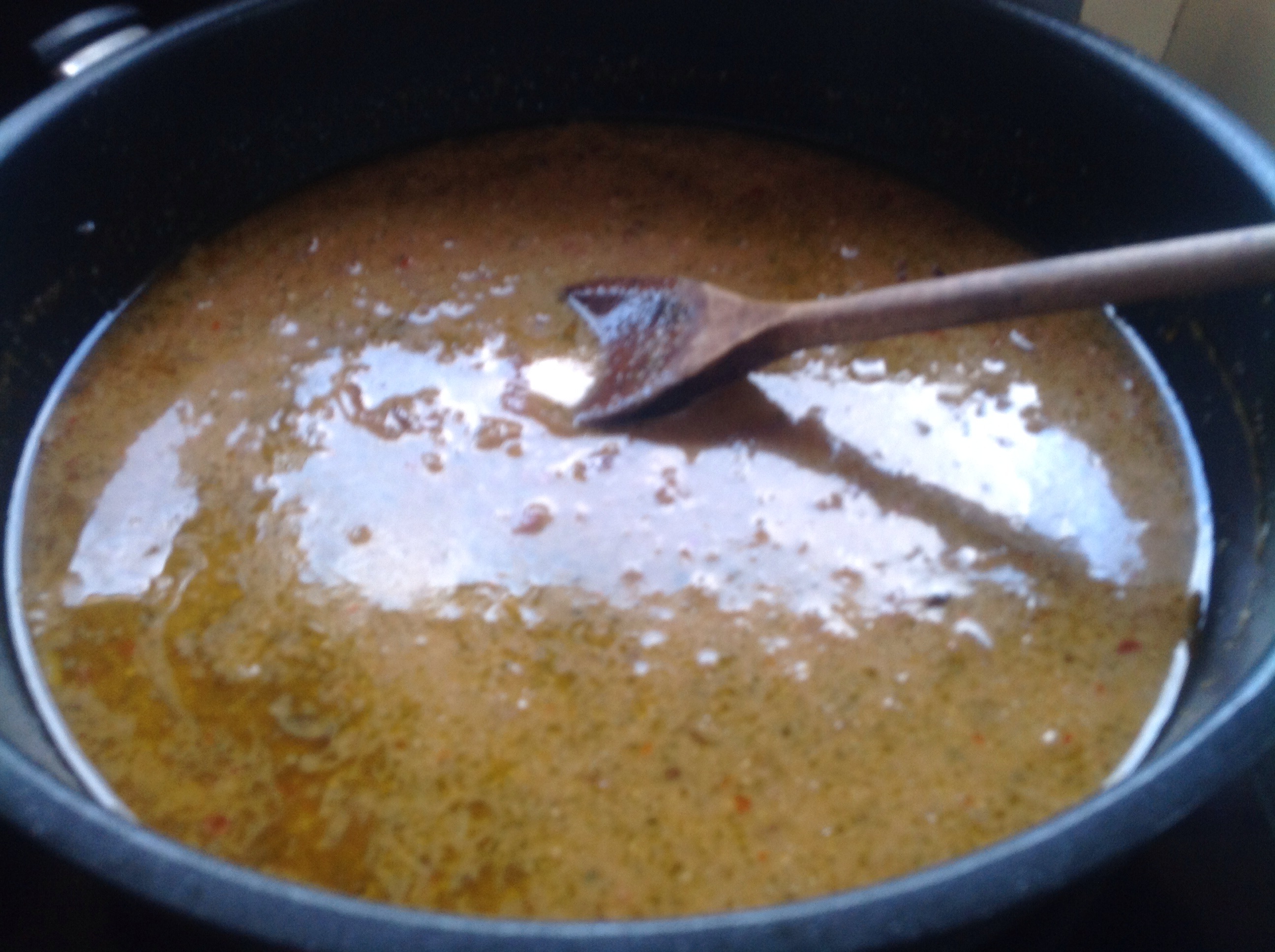 Gently fry the spice mixture for a few mins in a tablespoon of oil, coconut oil is the nicest here. Add the sliced onions and fry until slightly softened. In goes the rest, bring to a simmer.