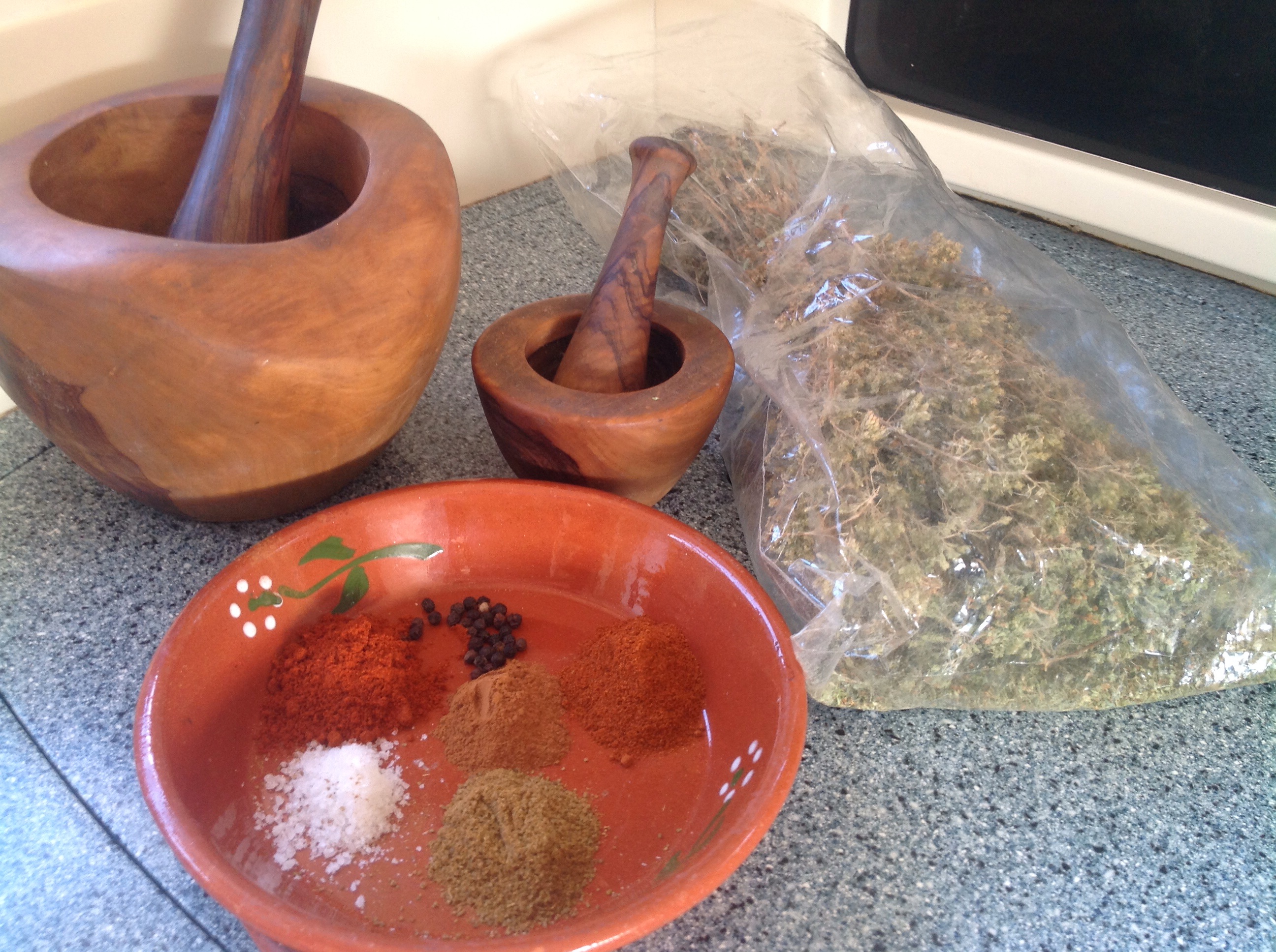 Ground cumin, chilli powder, sweet paprika powder, a little cinnamon, dried ground oregano.
