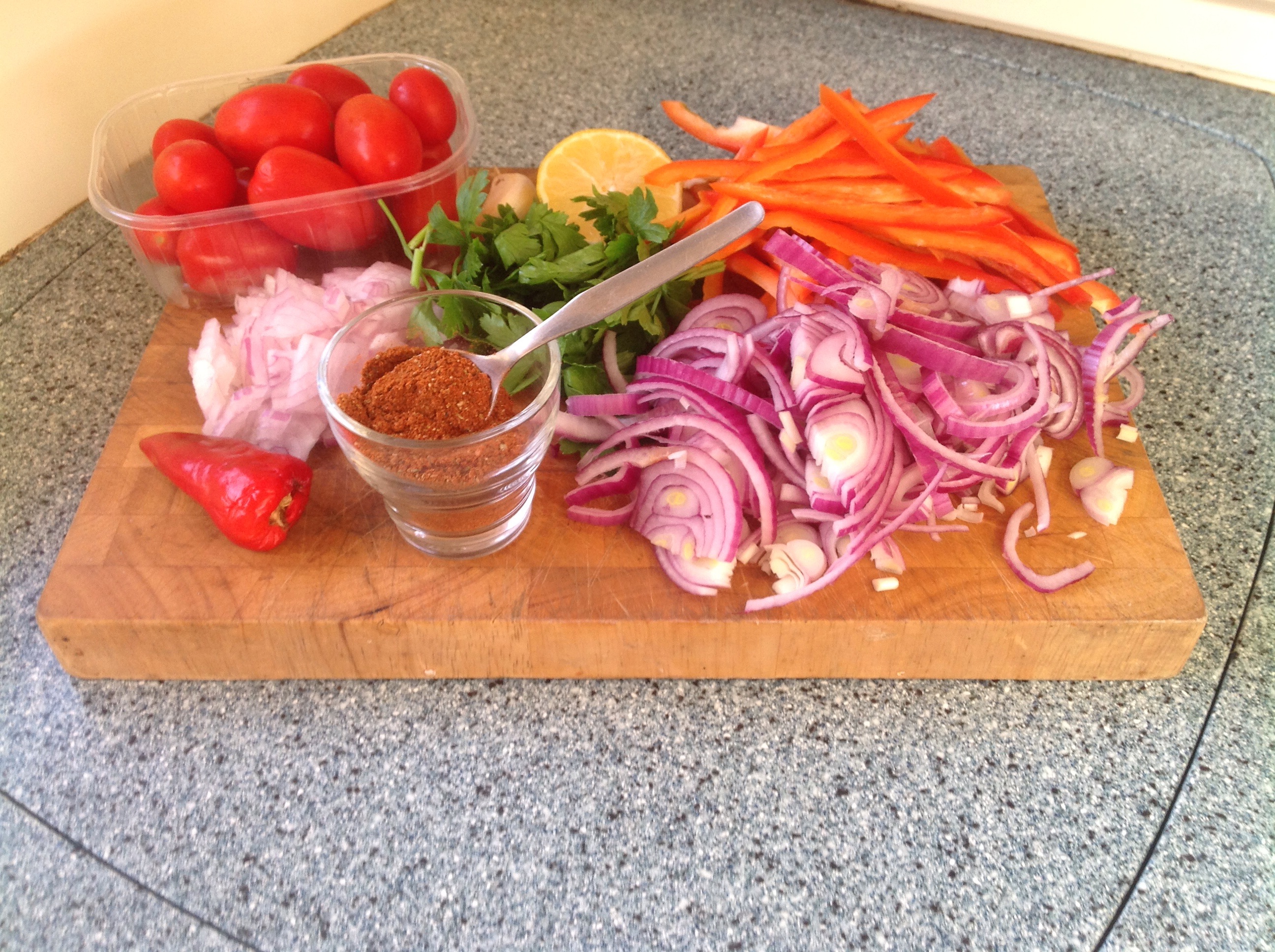 Gently fry diced onion, garlic, chilli in a little olive oil until softened. Chuck your diced or tinned tomatoes in and some tinned sweet corn if liked. Add 1/2 tsp of fajita spice! a splash of balsamic vinegar and a little water. (Sweeten by all means with a tsp of brown sugar or honey) Simmer to reduce then add a squeeze of fresh lemon juice and lots of chopped parsley (or if you’re lucky coriander – not available where I am).