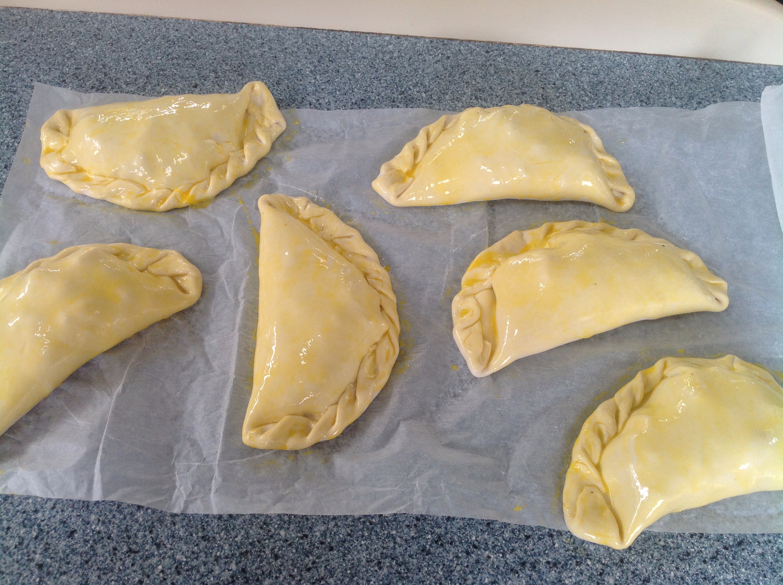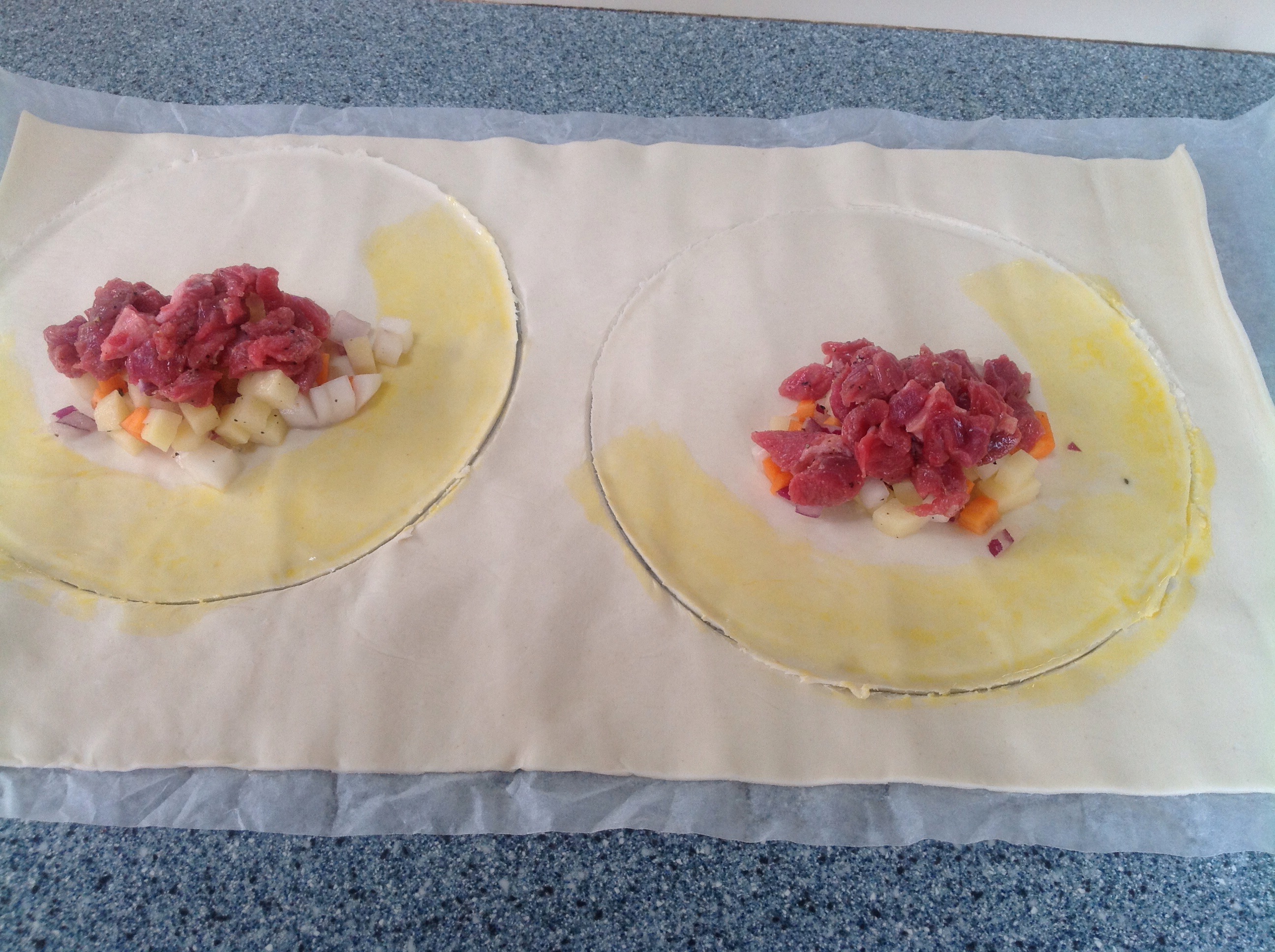 Again I cheated on the pastry, so unroll the puff pastry and place a small amount of veg and meat on each one. Add a little diced butter. Egg glaze the pastry and crimp it together.