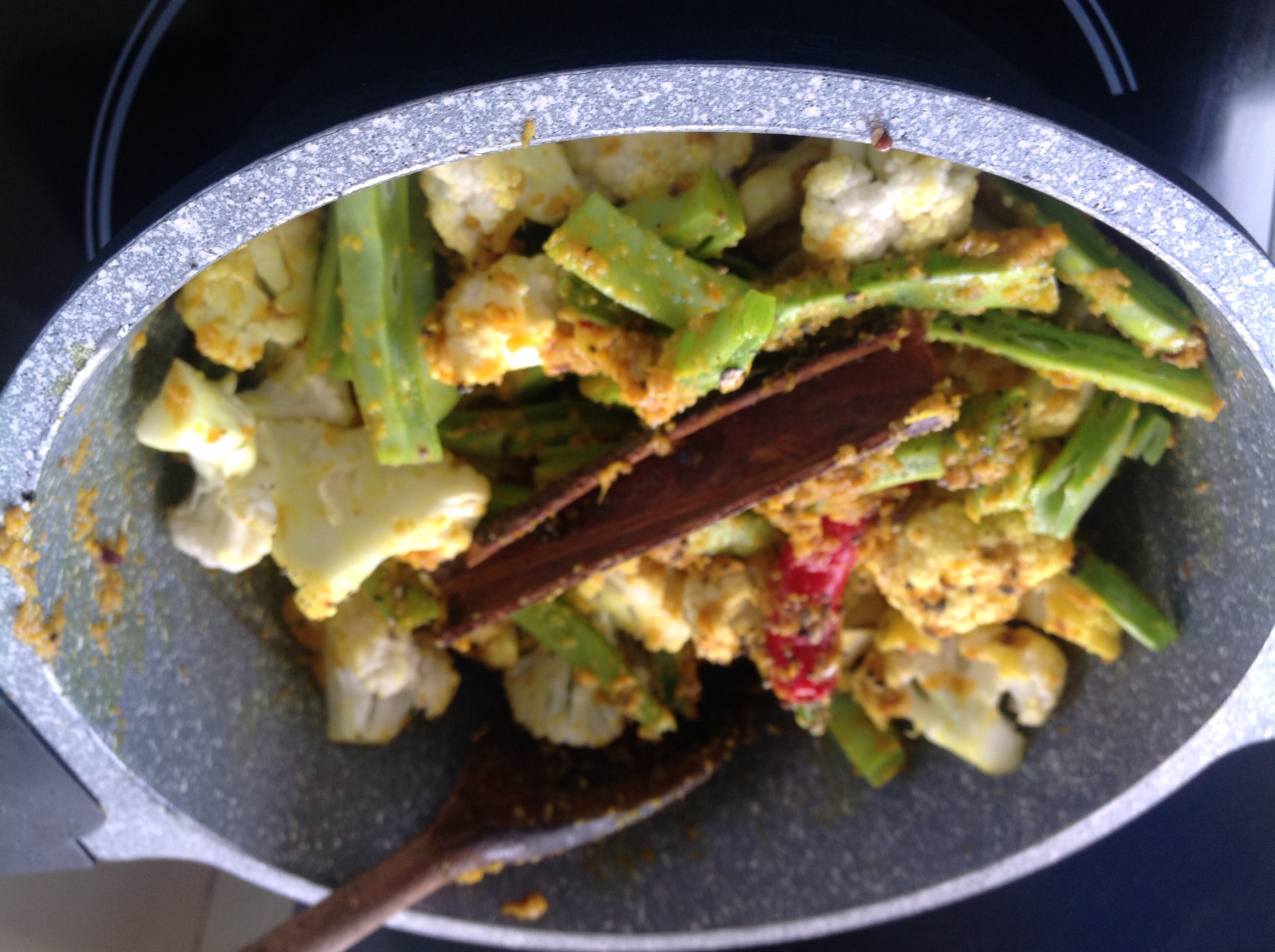 Ingredients: 300g runner beans, stringed and sliced. 300g cauliflower florets. 1 red onion; 3 cloves garlic; knob of fresh ginger; 1/2 tsp of turmeric, ground cumin, ground coriander; 1tsp curry powder. 1 small cinnamon stick, 1 chopped red chilli (remove seeds), 2 tsp mustard seeds, a few curry leaves, 400g tin of coconut milk. 1 tsp garam masala. Juice of 1 lime. Fresh coriander leaves.